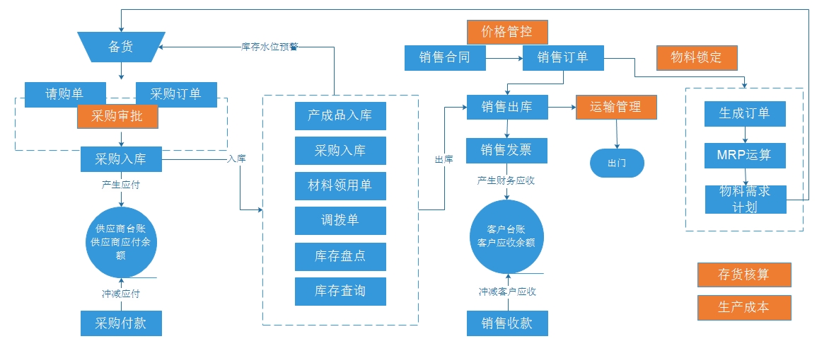4、生產(chǎn)環(huán)節(jié),重點將生產(chǎn)訂單、生產(chǎn)領(lǐng)料、以及報工和完工情況進行閉環(huán)管理。