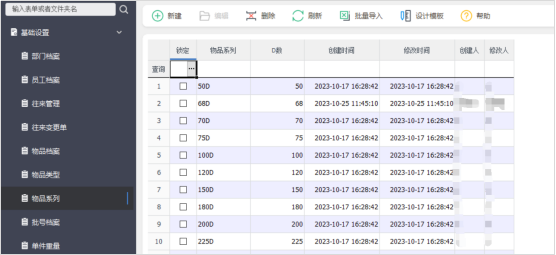 物品檔案信息主要包括物品名稱、規(guī)格、物品系列、物品類型、主單位等信息。